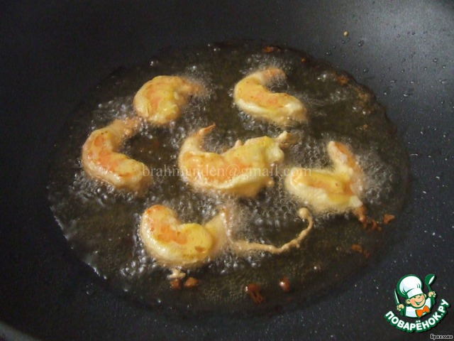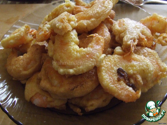 Наливаем масло, раскаляем до появления дымка и, окунув креветки в кляр, (мне это удобно делать обычным мед.пинцетом), помещаем в масло.