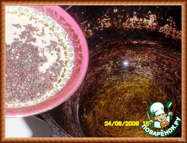 Нагрейте топленое или растительное масло в большой сковороде с утолщенным дном на умеренно сильном огне. Не доводя до появления дыма, бросьте семена горчицы и жарьте, пока они не станут сизыми и не начнут трещать. (Хорошо использовать крышку, чтобы семена не разлетались по плите.)