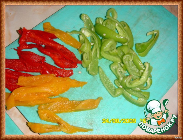 А пока займемся болгарскими перцами. Нарезать их вдоль тонкими полосками, без плодоножки и семян.