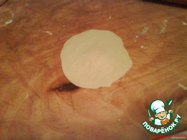 Раскатаем лепешечку диаметром около 7 см. Края сделаем более тонкими.