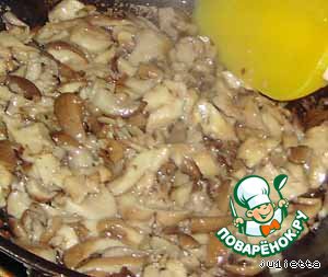 В сковороду положить 1/3 грибов, 2/3 курицы, влить 1/3 соуса. Потушить.