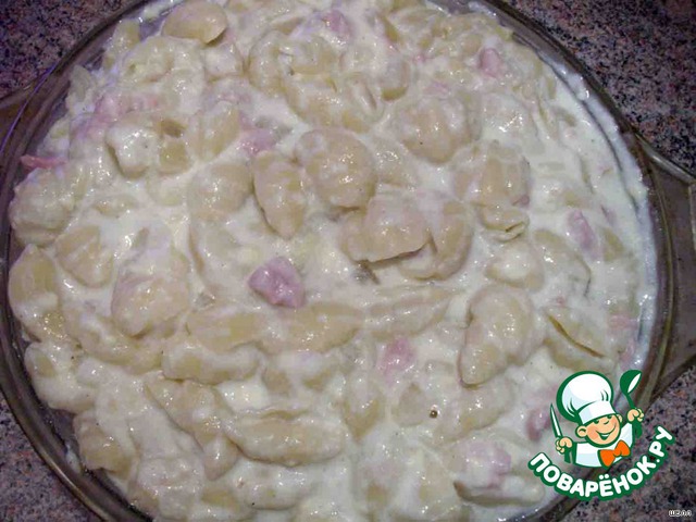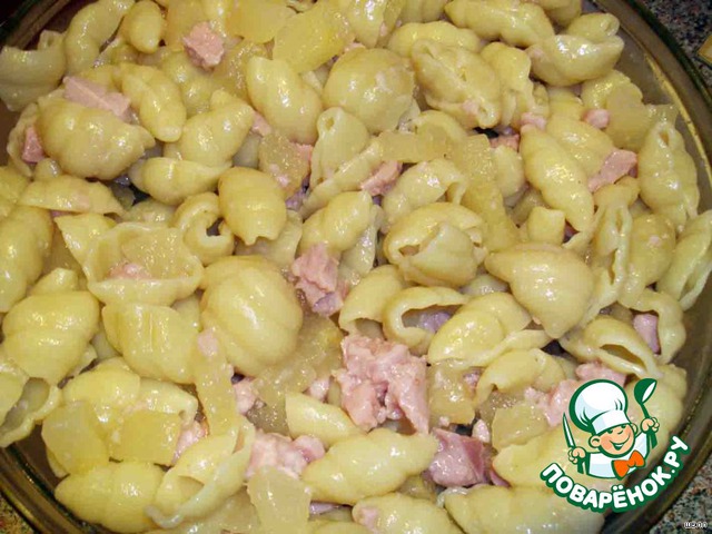 Берем форму для запекания, выкладываем туда наши макарошки, заливаем все луково-сырным соусом.