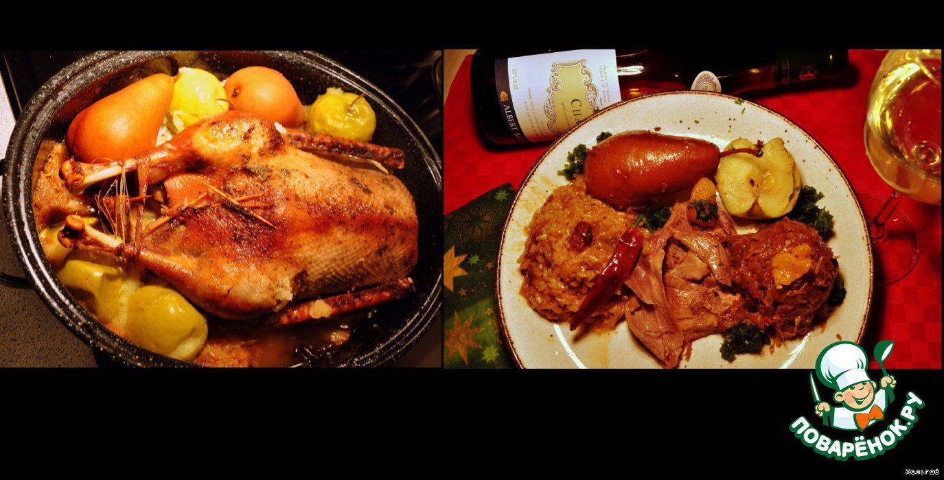 | Ну вот, пролетают праздники со стремительной скоростью. Уже и Старый Новый Год, хотя впереди еще Крещение. Просмотрев, истекая слюной, все рецепты гуся рождественского, решила добавить и свои 5 копеек в вариант готовки. Гуся я никогда ранее не готовила. Это мой, можно сказать, дебют с гусиком. Но результат превзошeл все ожидания... аромат привлeк всю семью и съели моментально. Всех дорогих поварят с праздниками и заходите угощаться!!! |