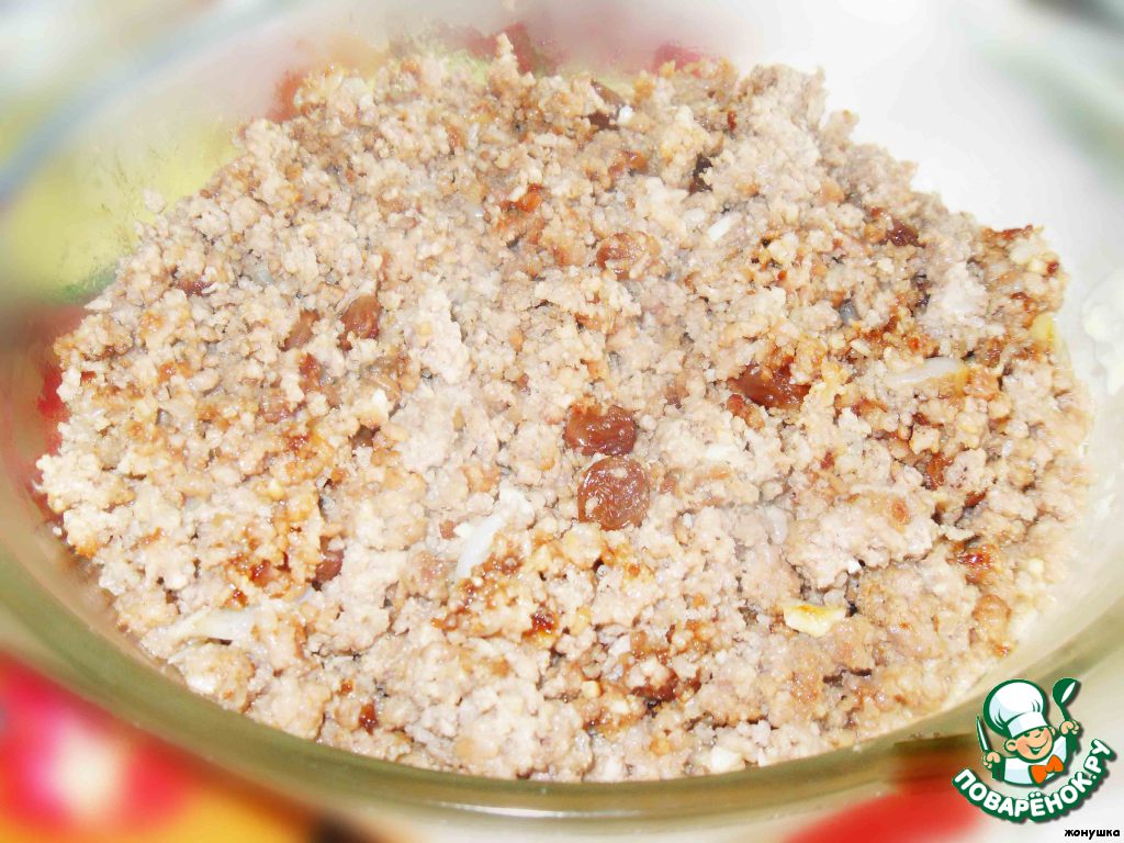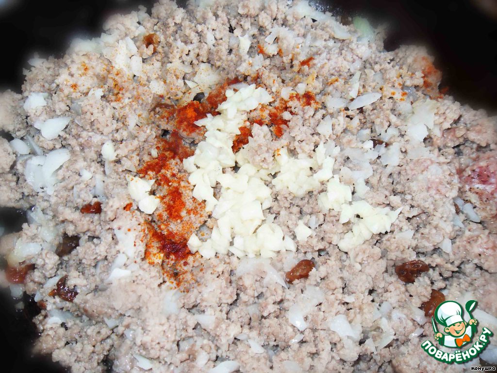 Фарш немного солим и перчим, поджарим на масле. Когда фарш слегка обжарится, добавим к нему две мелко нарезанные луковицы и изюм (заранее замоченный), все перемешиваем.