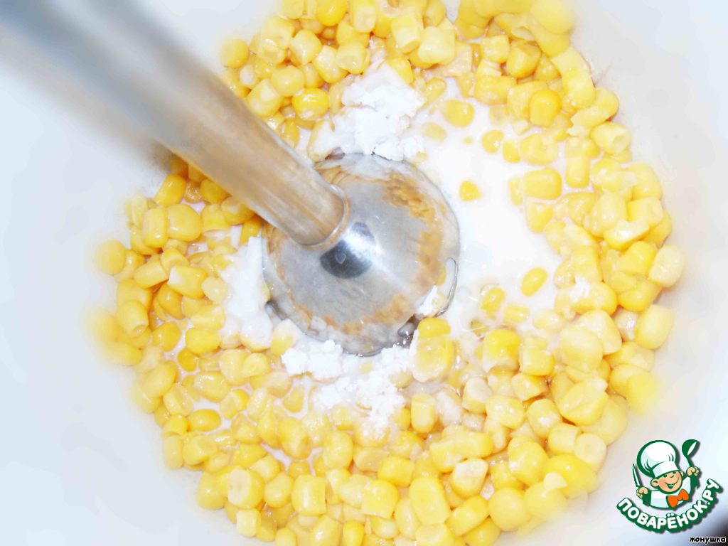 В блендере превращаем в кашу кукурузу. Это две маленькие баночки, с молоком (если нужно) и небольшим количеством растительного масла, добавляем крахмал.