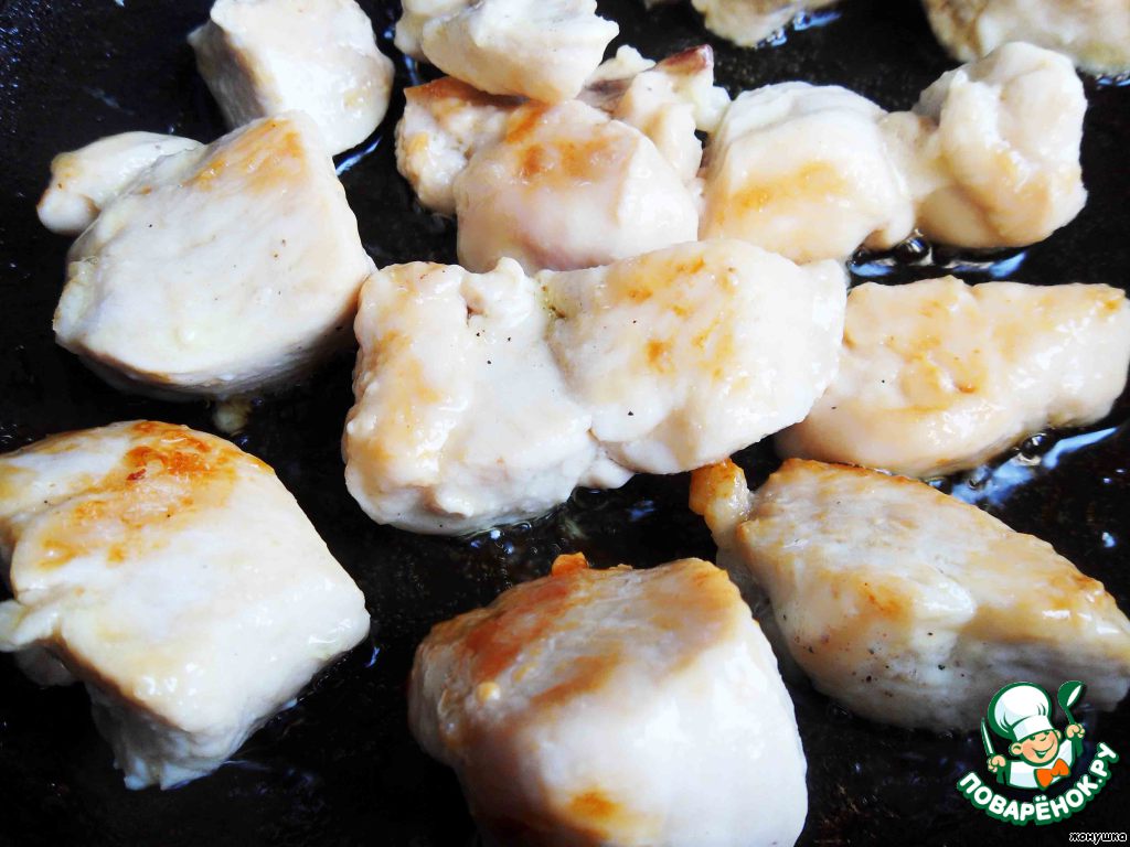 Куриную грудку разделим на несколько частей и слегка поджарим ее на оливковом или на подсолнечном масле, кому как нравится (буквально пару минут). Уменьшаем огонь и тушим 20 минут под крышкой.