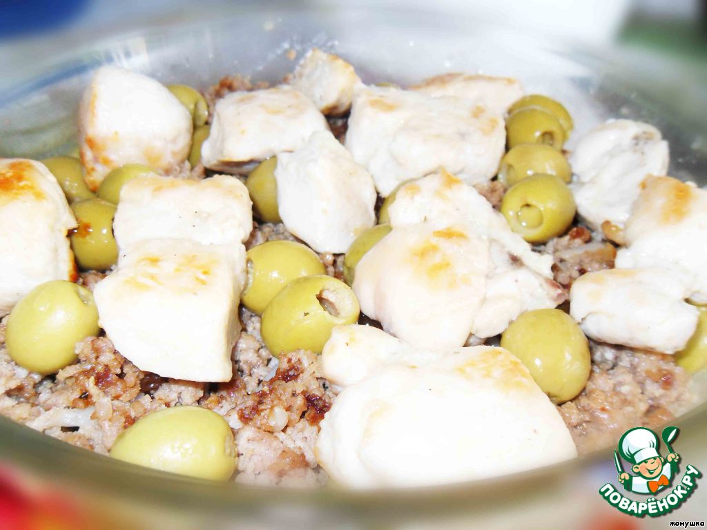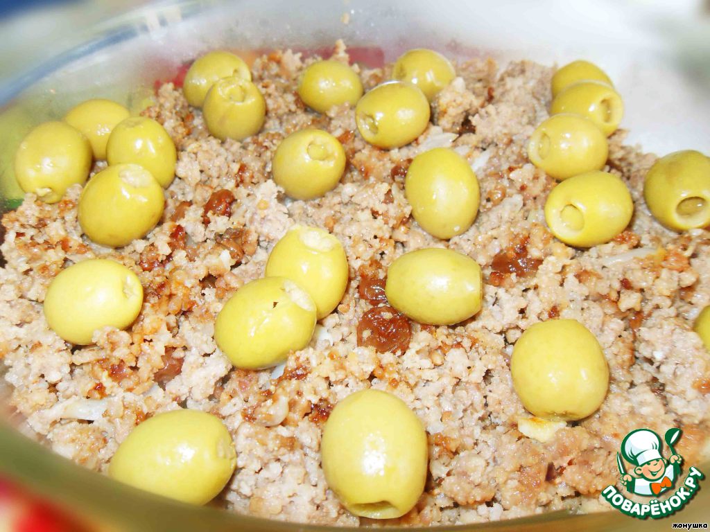 Сверху фарша идут маслины. Вообще-то, нужно больше маслин, но у меня была одна баночка.