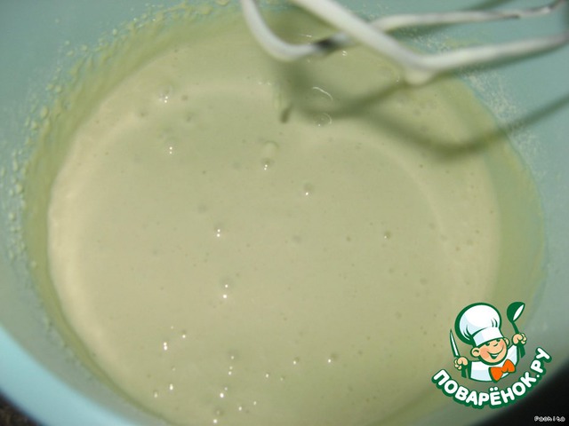 Яйца смешать с майонезом, сметаной, добавить разрыхлитель и муку.