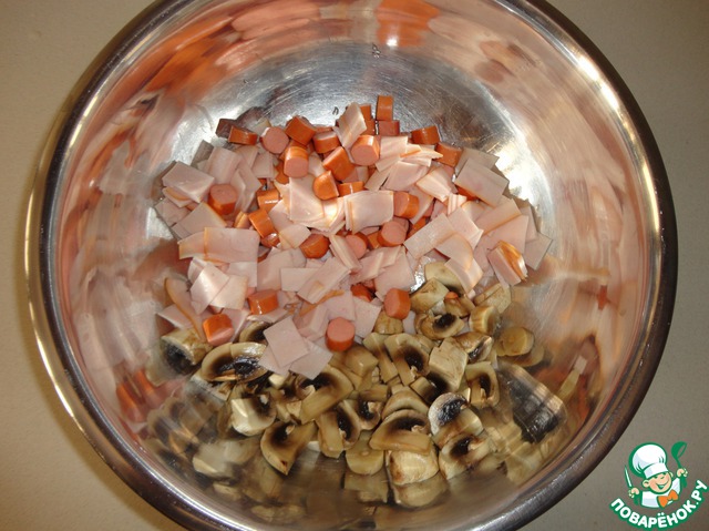 В миску побольше кладем порезанные сосиски, ветчину и грибы.
