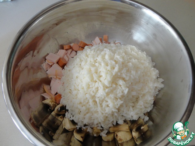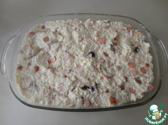 | Честно говоря, мои мальчики не очень хорошо кушают рис. Но это суфле они едят с большим удовольствием. Рис с грибочками, подкопченными сосисками и ветчиной в соусе бешамель с разными сырами... думаю, это придется по душе каждой нехочухе! |