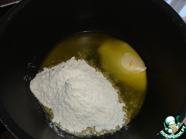 Далее делаем бешамель. Для этого в большую кастрюлю кладем наши масла и ставим на огонь. Когда сливочное масло почти растопится, добавляем 8 ложек муки.
