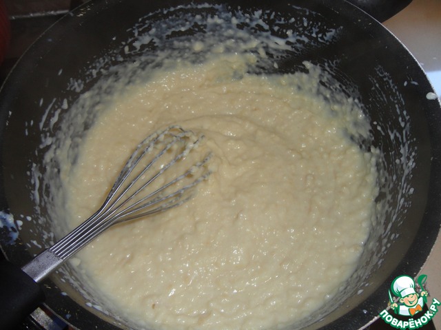 Затем постепенно, по немногу начинаем добавлять горячее молоко. При этом постоянно и интенсивно перемешиваем. В процессе не забываем добавить приправы.