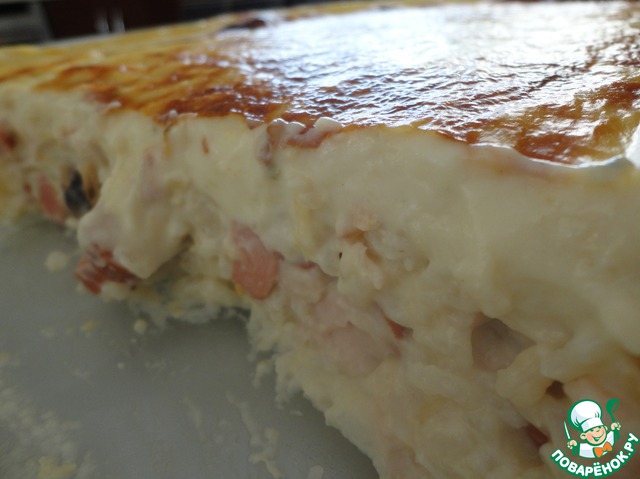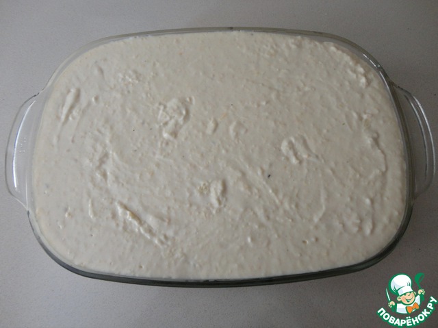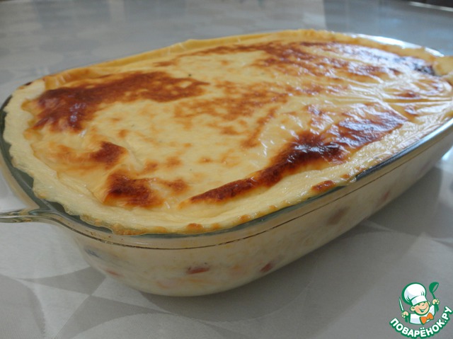 Сверху заливаем оставшимся соусом. Ставим в духовку, разогретую до 190 градусов, и запекаем, пока суфле сверху не станет золотистым.