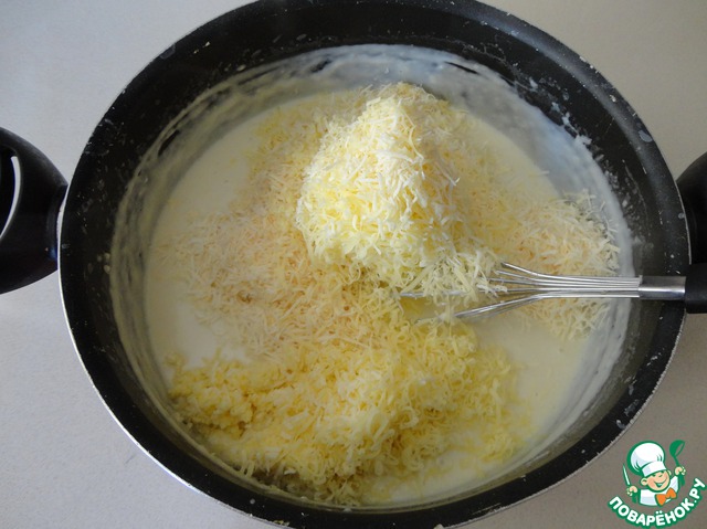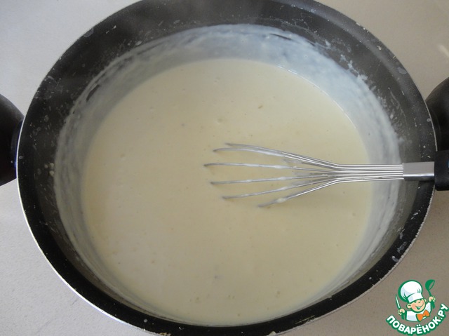 После того, как добавили последнее молоко, даем бешамели закипеть, не переставая помешивать, и снимаем с огня.