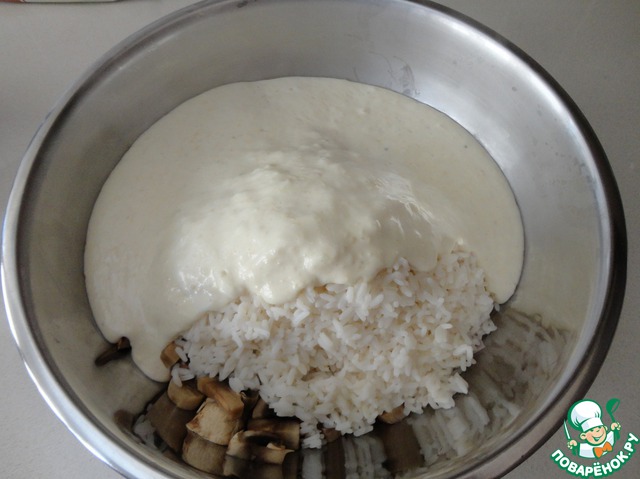 Примерно 2/3 бешамели добавляем в миску с рисом и перемешиваем.