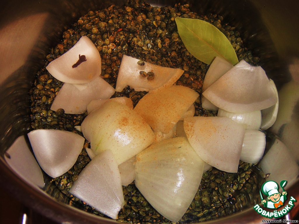 Первым делом мы ставим вариться чечевицу в большом количестве воды, добавив к ней крупно нарезанную половинку луковицы, щепотку молотого имбиря, лавровый лист и гвоздику. Нам потребуется минут 25, так как чечевица должна быть хорошо проваренной, но не до состояния каши.
