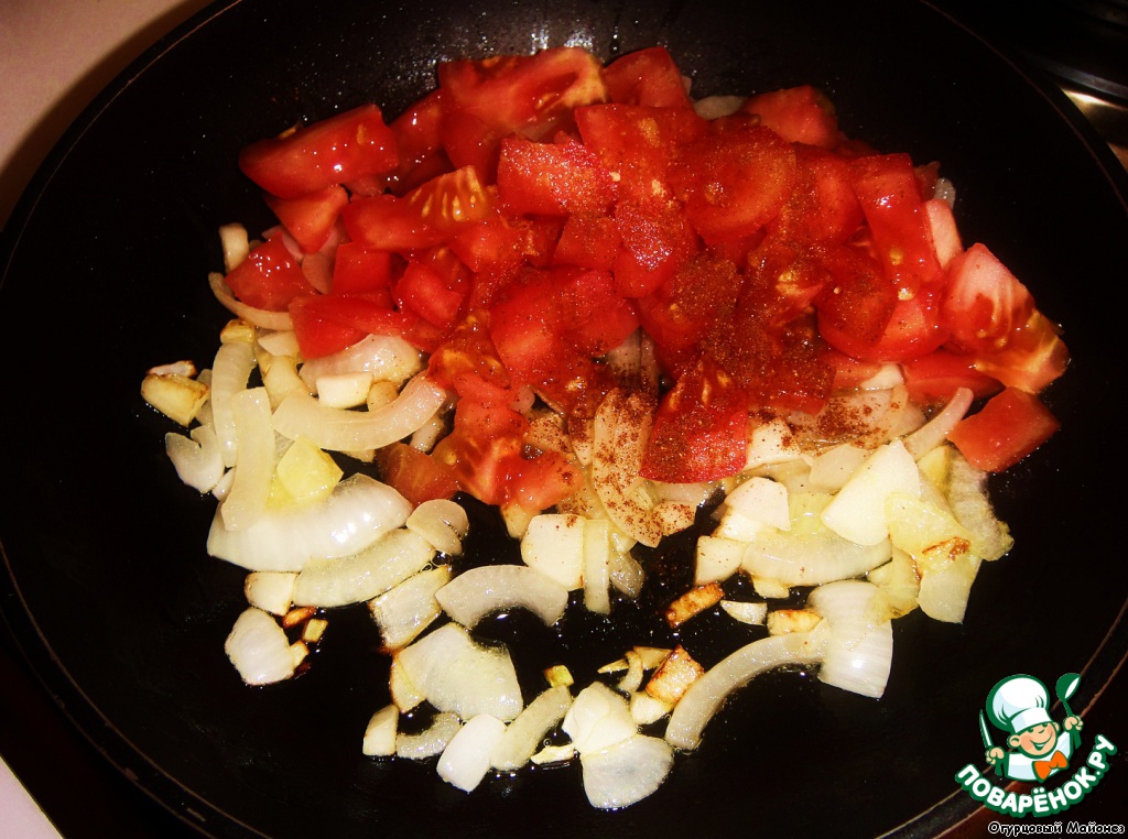 На растительном масле обжариваем вторую половинку луковицы, нарезанную относительно тонкими полукольцами, вместе с луком зажаривается и порубленный чеснок. Как только лук приобретёт желтоватый оттенок, мы добавляем мелко порезанный помидор без кожицы.