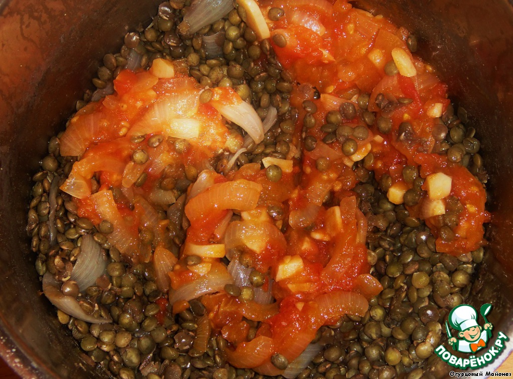 Как только сварилась чечевица, добавляем к ней зажарку и перемешиваем.