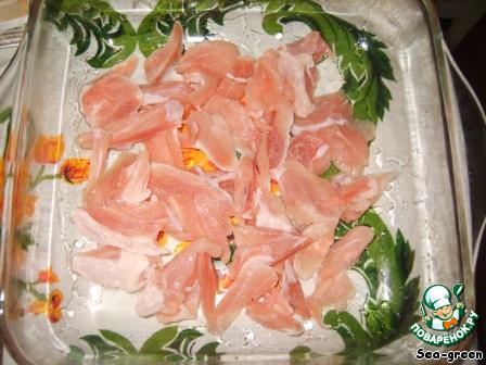 Окорочок немного разморозить и настругать при помощи ножа в форму для выпекания, смазанную маслом.