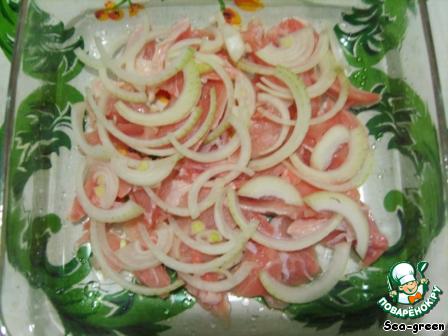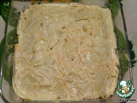 Сверху аккуратно смазать сметаной (майонезом) и поставить в разогретую духовку на 30 - 35 мин.