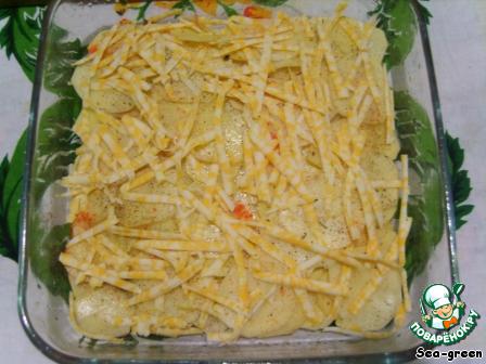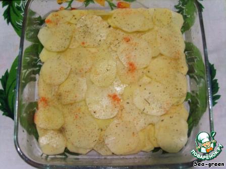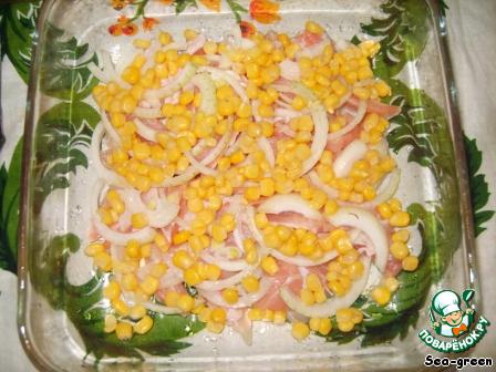 Картофель почистить и тонко (лучше с помощью овощечистки) нарезать пластинами, которые плотно уложить на кукурузу. Можно в несколько слоев (у меня получилось два). Слегка посолить, посыпать любимыми приправами.