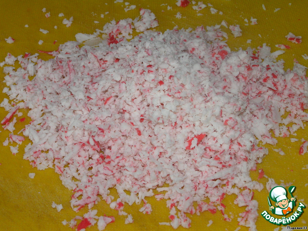 Натереть сыр и яйцо, смешать с палочками, добавить измельченный чеснок, посолить, поперчить, смазать майонезом