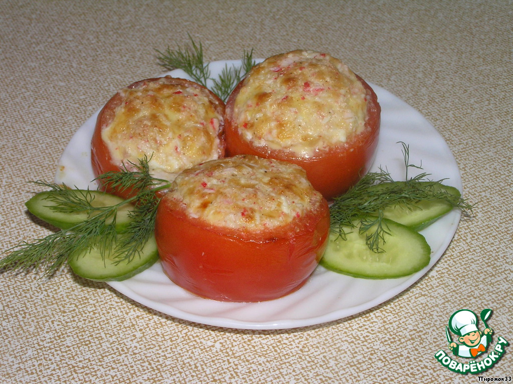 Начинить помидоры сырной массой и поставить минут на 10 в духовку или на пару минут в СВЧ, чтобы сыр расплавился.