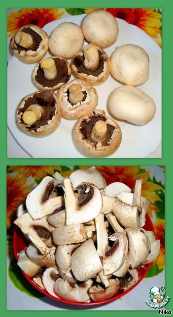 Шампиньоны лучше покупать не раскрытые, а в белой плёночке. Протереть мокрой тряпочкой от земли (мыть грибы не надо, т.к. они впитают влагу и будут кипеть, а не жариться). Очистить от плёночки и нарезать.