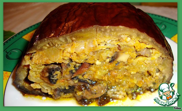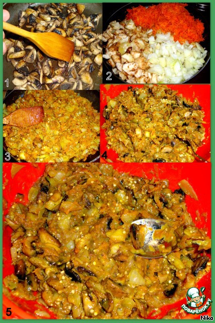 Пожарить шампиньоны, мякоть баклажана, лук, морковь. (У меня морковь тёртая, лучше, если она будет нарезанная на мелкие кусочки, тёртую плохо видно, сливается с другими овощами).