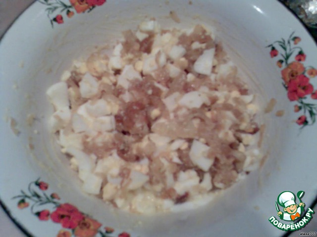 Яйца сварить, порезать и смешать с луком. Слегка посолить, поперчить.