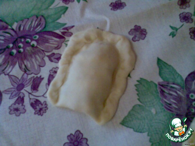 Тесто раскатать потоньше и разрезать на полоски шириной 7-8см и длиной 20см, положить на каждую полосочку начинку ближе к краю. В одну штучку положить кусочек горького перца, по поверьям, кому достанется такая "пельмешка", тому особое счастье в Новом году будет.