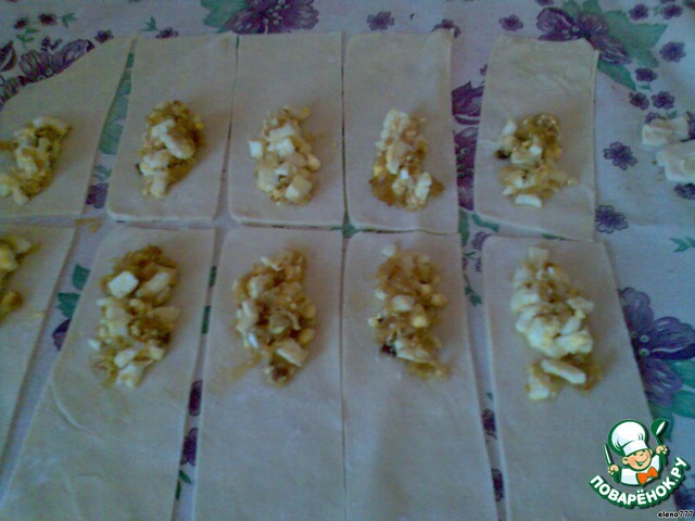 Сложить полоски, т.е. свободный от фарша край теста загнуть и положить на фарш. Края защипать.