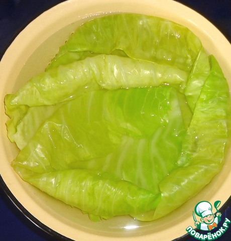 Для приготовления мешочков понадобятся капустные листья. Чтобы отделить листья от кочана, не повредив их, нужно кочан положить в горячую воду на несколько минут, и уже размягченные листья отделить от кочана и с помощью ножа аккуратно срезать толстые прожилки. Затем капустные листья положить в воду, довести до кипения и варить до полуготовности, важно чтобы капустные листья не разварились.