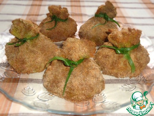 "Мешочки" выложить на противень, застеленный пекарской бумагой, смазанной растительным маслом и выпекать в разогретой духовке до 180- 200 градусов 20-25 минут. С готовых мешочков убрать нитки и оформить зеленым луком.