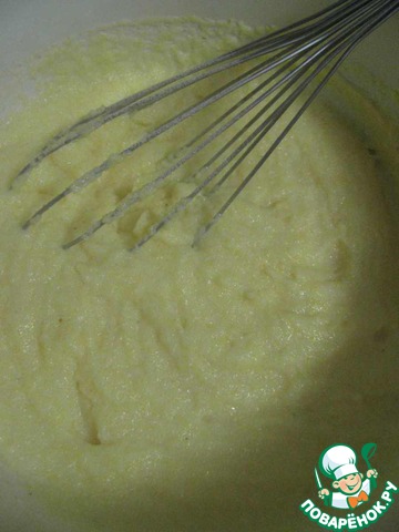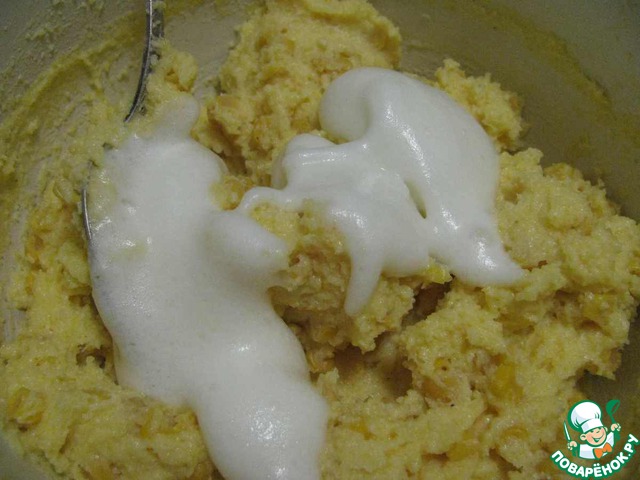 4. Затем кукурузу и 2 желтка ввести в кукурузную кашу. Следом подмешать белки.