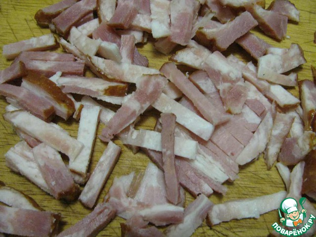7. Салями (у меня была копченая грудинка) нарезать узкими брусочками.