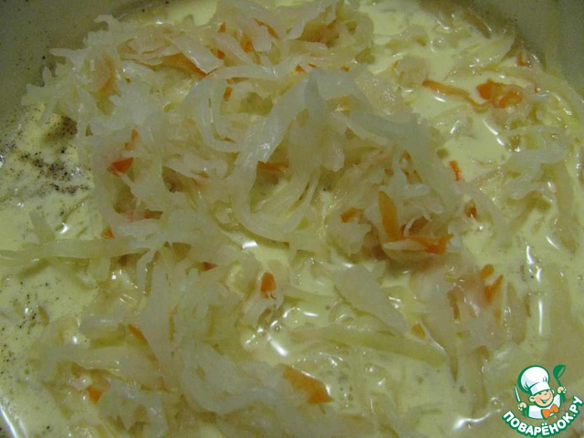 9. Посолить, поперчить, приправить мускатным орехом и щепоткой сахара. Добавить квашеную капусту.