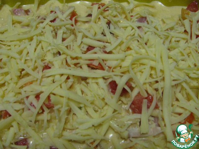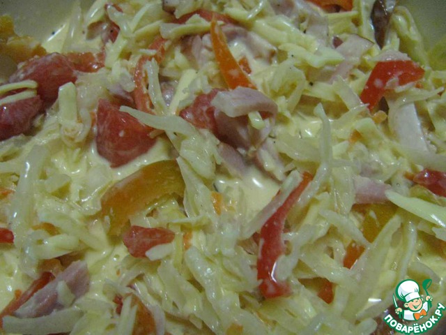 10. Затем помидоры, сладкий перец, салями и 2/3 сыра. Все хорошо перемешать.