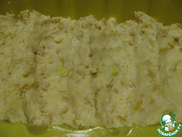 11. Форму для запекания смазать жиром и выложить кукурузную кашу волнообразно.