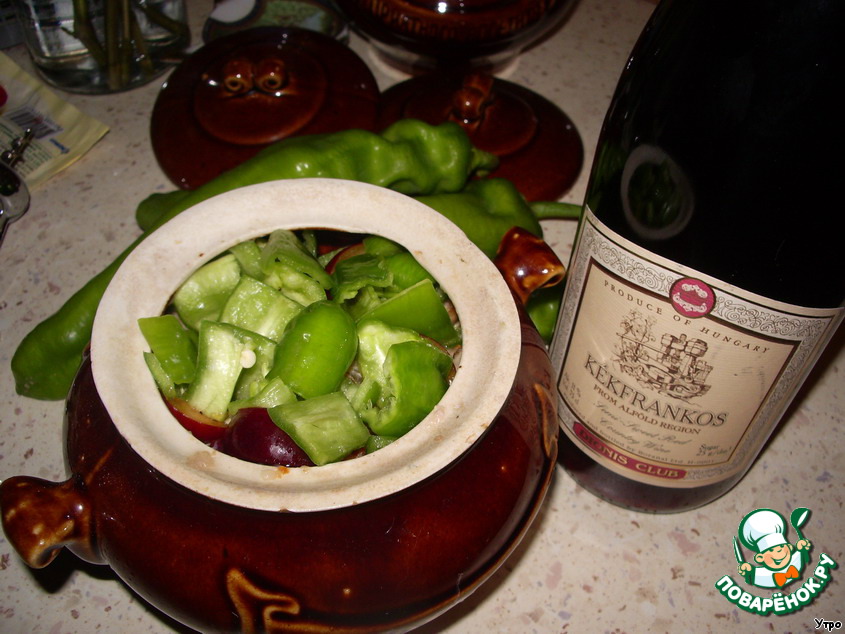 Складываем в горшочек немного слив, затем перец, мясо, еще раз сливы и перец. Солим. Разбавляем вино 1 стаканом воды. И заливаем горшочки так, чтобы жидкость едва показалась, если налить много, то во время готовки будет все брызгаться.