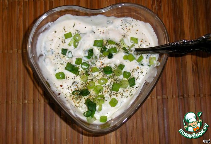 Для соуса смешать майонез, сметану, приправу и мелко нарезанный зеленый лук.