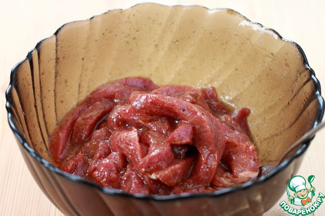 Мясо нарежьте тонкими полосками. Из 2 ст. л. соевого соуса, 1 ст. л сахара, 2 ст. л кукурузного крахмала, 2 ст. л растительного масла и ½ ч. л черного молотого перца приготовить маринад. Положить мясо в маринад и оставить на то время, пока варится рис.