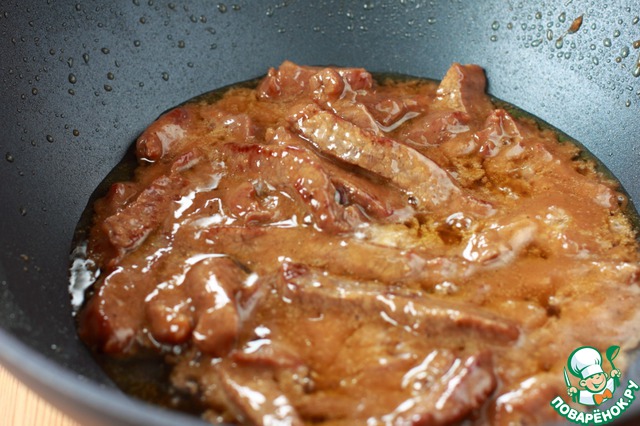В вок налейте 3 ст. л. растительного масла, добавьте замаринованное мясо вместе с маринадом и обжарьте на сильном огне до готовности.