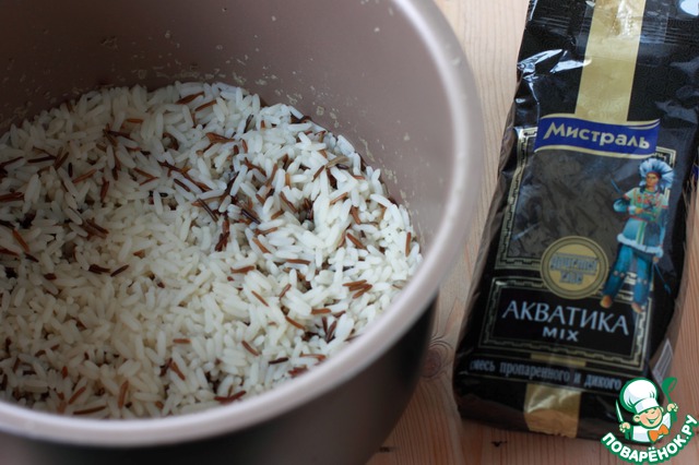 Микс пропаренного и дикого риса залить водой из соотношения 1 часть риса - 2 части воды и сварить до готовности (40 минут).
