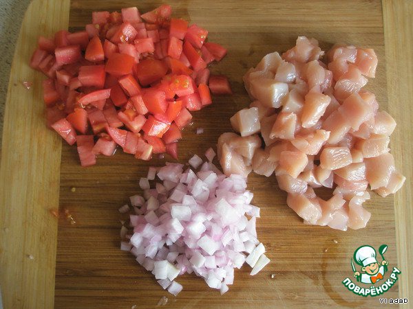 Чистим и режем мелко лук. Куриное филе моем, обсушиваем и тоже режем на небольшие кусочки. Режем небольшими кубиками помидор.