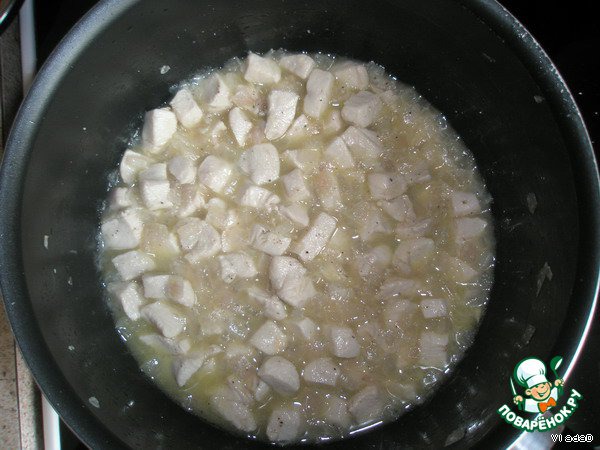 Обжариваем при сильном огне на оливковом масле куриное филе и лук несколько минут. Солим, перчим и гасим вином. Оставляем несколько минут на сильном огне, чтобы испарилось большинство жидкости.