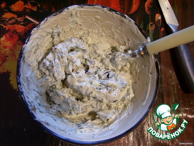 Брынзу (я беру не очень соленую) размять вилкой, добавить раздавленный чеснок.