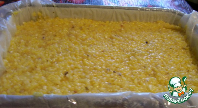 Выкладываем нашу поленту в форму для запекания, смазанную маслом (или как у меня-в форму, покрытую бумагой для выпечки)и оставляем на некоторое время.