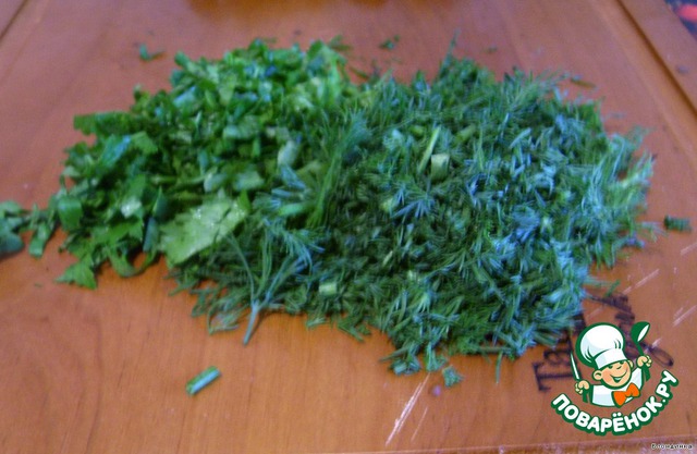 В брынзу добавить маслины и зелень, поперчить, добавить травки (у меня-базилик и эстрагон).