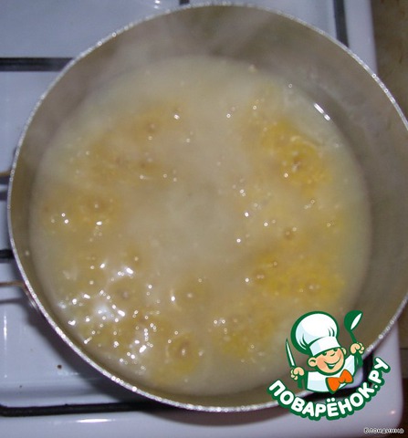 В 1 литр кипящей подсоленой воды постепенно всыпать 1 стакан крупы, помешивая, убавить огонь и варить примерно 30 минут, не забывая помешивать, до загустения (где-то слышала, что поленту нужно варить неприменно в кастрюле с толстыми стенками, лучше чугунной или медной и размешивать деревянной лопаткой. Не знаю, так ли это, я обошлась обычной алюминиевой кастрюлькой, к которой ничего не пригорает). Масса должна стать густой, даже похожей на тесто, и отлипать от стенок кастрюли